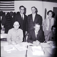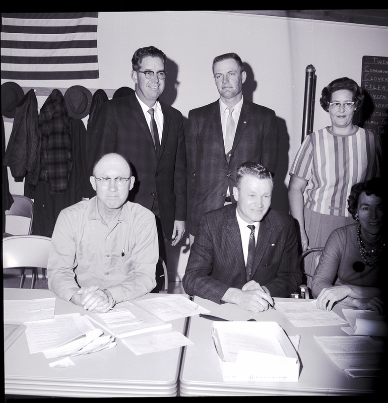 meeting at the Farm Bureau Office. Seated from left to right are I. R. Kevan, secretary, and Donald Martens, president. Standing from left to right are Louis Reinke, first vice president, and Charles Harris, second vice president. Two women officers are standing to the right. Several papers are on the table in front of them. A coat hanger is on the back wall, covered in hats and coats. An American flag hangs on the wall above it.