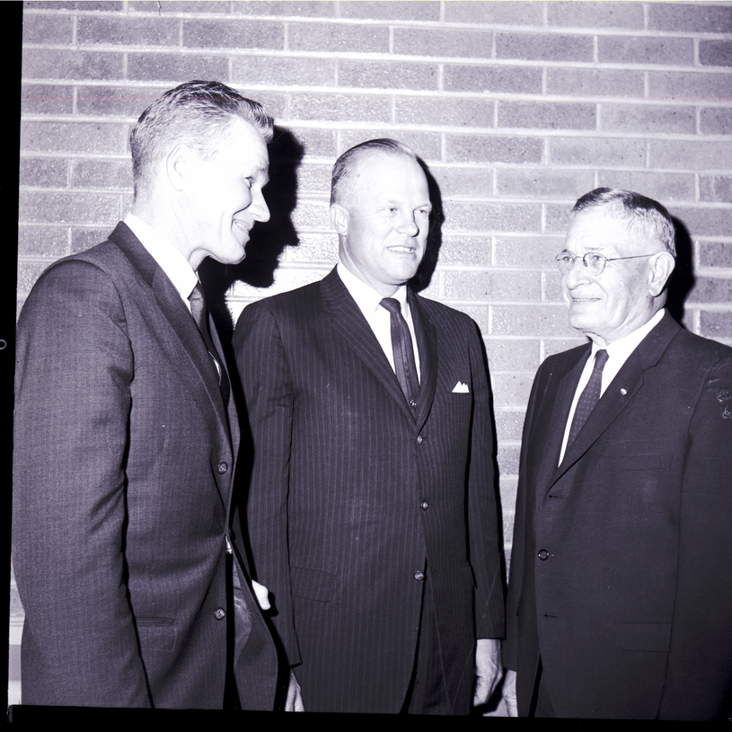 Discussing Farm Bureau programs after the Twin Falls County Farm Bureau's annual banquet are, from left to right, Donald Martens, president of the Twin Falls County Farm Bureau, Marvin Morrison, past president of the Arizona Farm Bureau Federation, and John Sanborn, former U. S. representative.