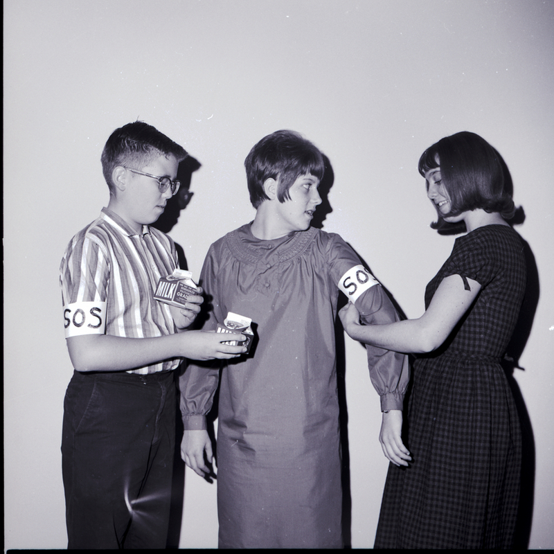 Preparing for the annual SOS drive to collect funds to purchase surplus food for hungry nations are, from left to right, David Cross, Beverly Martinsen, and Teresa Cole. The event is sponsored by the Twin Falls Ministerial Association, and junior and senior high students from eight different Twin Falls churches participated.