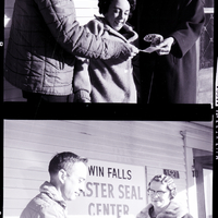 Robert Meuleman, Easter Seal Center bus driver, presents a check for $175 donated by the Union Pacific Old Timers Club to Mrs. E. P. Messner, Easter Seal Center worker, while Karleena Hills watches. Behind them the Twin Falls Easter Seal Center is visible. They are all dressed in thick winter coats.