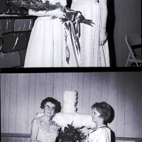 In the top image, Mrs. Margaret Harrell, grand guardian of Idaho, International Order of Job's Daughters, admires the beautiful bouquet of roses held by Mrs. Mary Etta Wright, supreme guardian. In the background behind them is a Biblical display. A folding chair sits in the corner. In the bottom image, Connie Van Ostran, honored queen of Bethel No. 43, hands Mrs. Mary Etta Wright the bouquet of roses. Behind them is a large white cross.