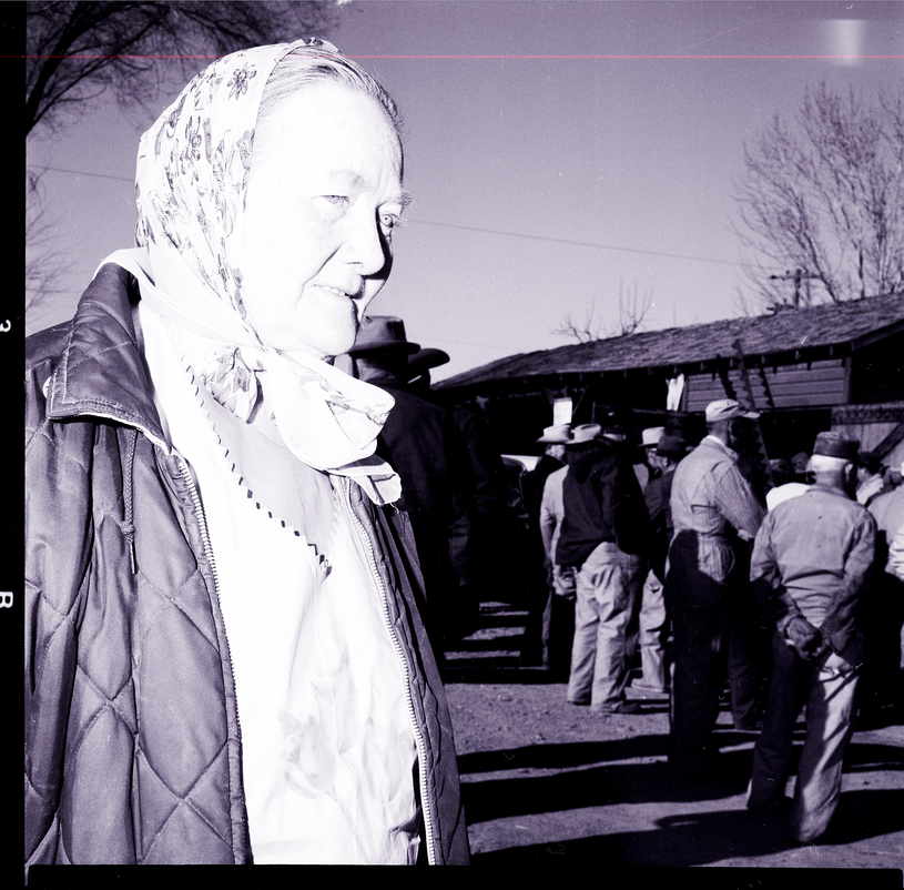Mrs. Howard Lapray stands to one side of the auction crowd listening to the sounds of auction on the farm estate of her late husband. She is wearing a coat and a scarf over her head. A crowd of men, a house, and some trees are in the background.