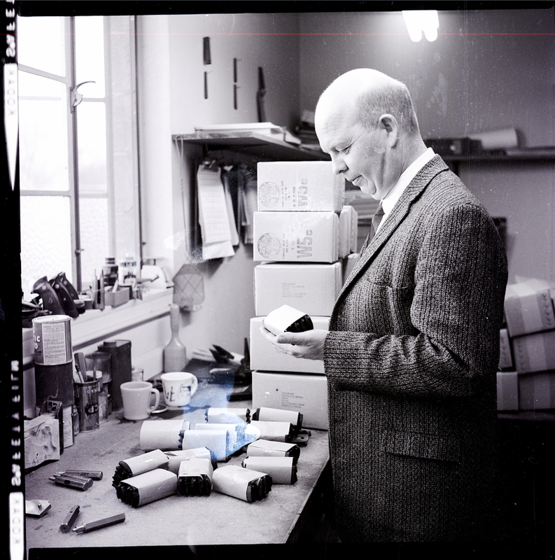 Inspector for the U. S. Army Ordnance Department, Merrill Faulk, examines a packet