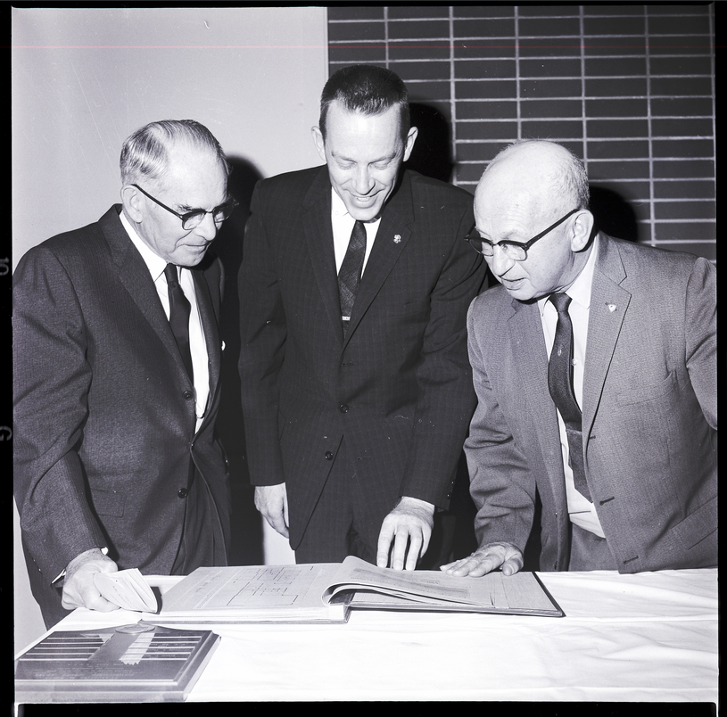 - Board of Directors officers for the YMCA look over a YMCA scrapbook. From left to right are John B. Sims, secretary, Gordon Cox, president, and Howard Burkhart, treasurer. They are dressed in suits and ties. On the desk is a plaque.
