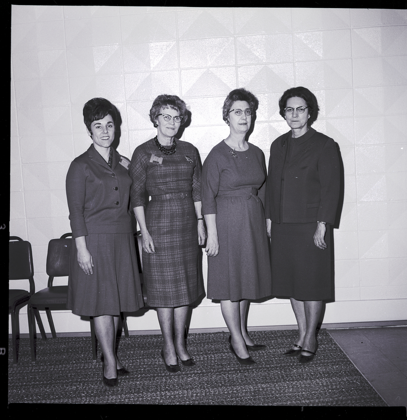 Officers meeting of the Extension Homemakers Councils and Extension Home Economics Agents was held in the Rogerson Hotel in Twin Falls. From left to right are Mrs. Ben Eldredge, president of the Twin Falls County Extension Homemakers Council, Mrs. H. V. Beaver, district director, Mildred Haberly, state home economics leader at Idaho State University, and Agnes Hurst, Twin Falls County extension home economics agent. They are all wearing dresses. Behind them are a few chairs.