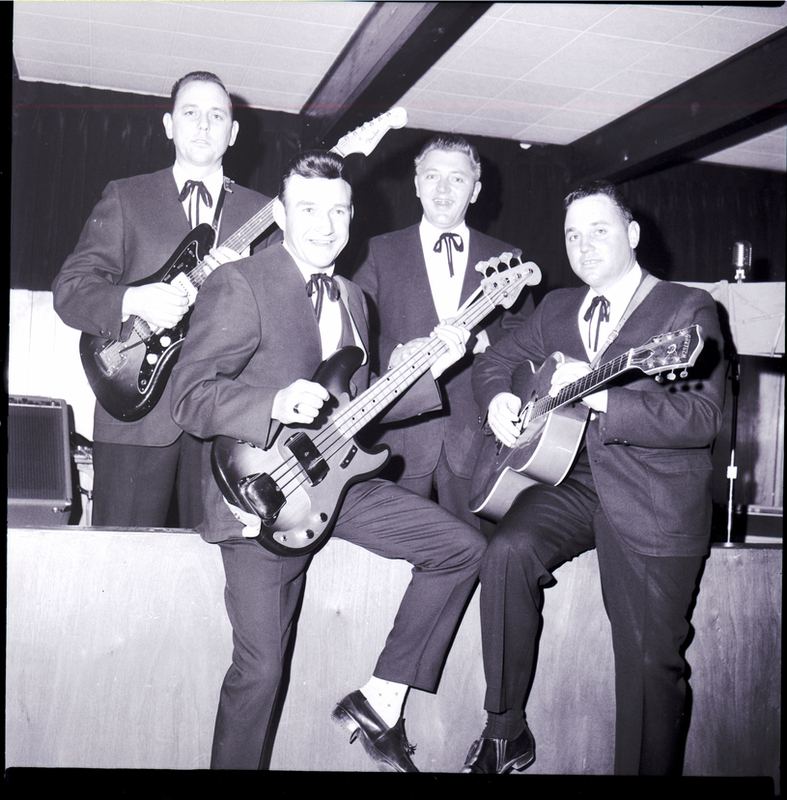The Walden Brothers appear at the fifth annual Country Music Jamboree, held at Filer High School auditorium. From left to right are Junior Walden, lead guitar, Frank Herman, bass, Harry Hansford, drums, and Loy Walden, rhythm guitar. They are dressed in suits and western bow ties and holding guitars. A speaker and a microphone are visible on the stage behind them.