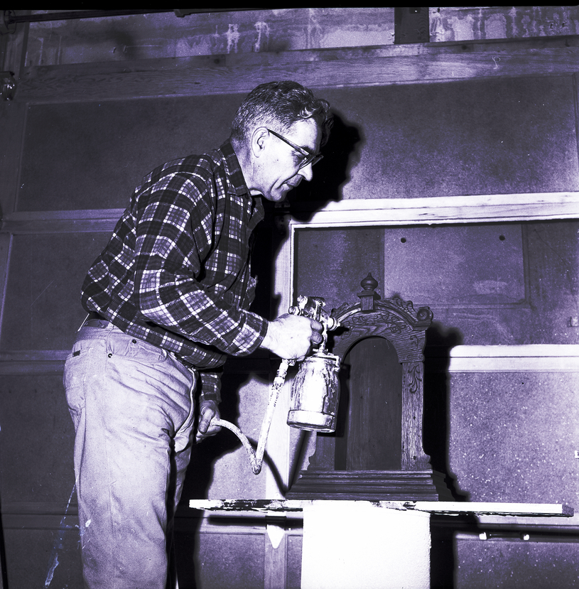 - Craig Graybill refinishes an antique clock. He is wearing a plaid shirt and pants and holding a spray gun. Only one part of the clock, which was damaged in a fire, was usable in restoring it. Mr. Graybill made all the other parts.