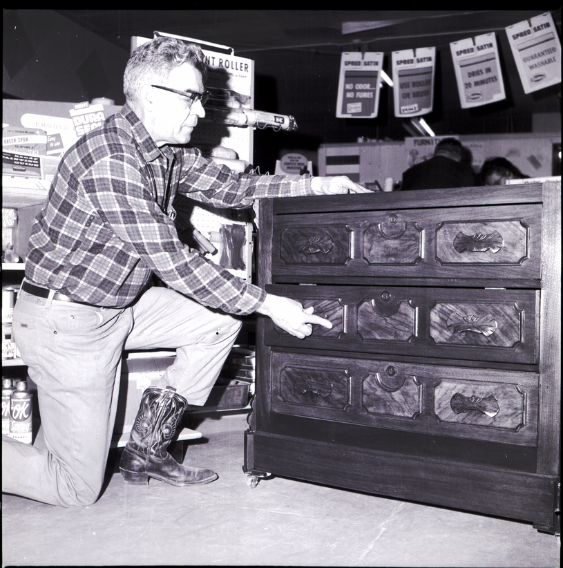 Craig Graybill refinishes an antique dresser. He is wearing a plaid shirt, pants, and cowboy boots. Behind him is a shelf holding cans of paint, vanish, and enamel spray. Two other people can be seen in the background behind the dresser. A banner of ads for Spred Satin hang from the ceiling.