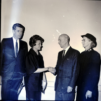 Probate Judge Zoe Ann Shaub, second from left, and Judge O. P. Duvall, third from left, shake hands after Judge Shaub was reinstalled as chairman of the Salvation Army Advisory Board. At left is Rev. R. Lewis Graham, special speaker at the annual meeting, and at the right is Salvation Army Major Marie Anderson. The men are wearing suits and ties, Judge Shaub is wearing a dress suit, and Major Anderson is wearing a Salvation Army uniform.