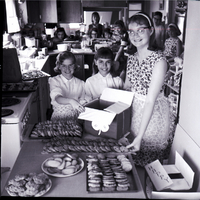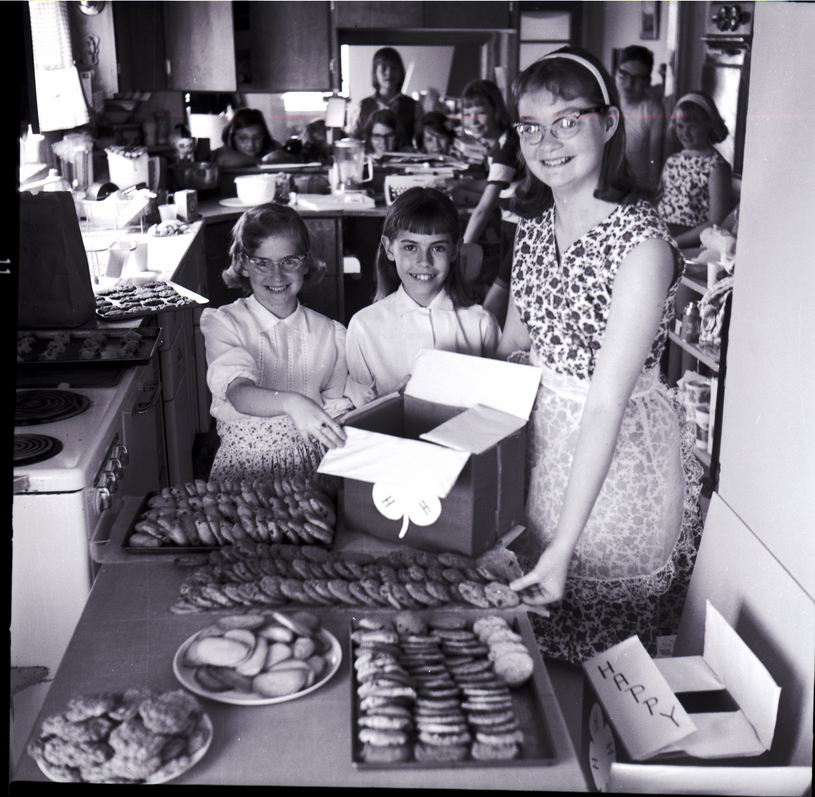 Members of the Happy-Go-Lucky 4-H Club prepare Easter cookie boxes for residents of local nursing homes. In the foreground, from left to right are Vicki Huber, Anita Roberts, and Beth Britt. Several plates of home-baked cookies are on a table, and the three girls package them up into boxes with 4-H logos on the side. A counter, covered in cooking sheets of cookies and cooking utensils, stretches around the kitchen. In the background, several other girls stand around the counter.