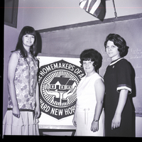 New FHA officers, from left to right, are Rhonda Miracle, president; Vicki Bickford, secretary; and Christine Newbry, treasurer. They are wearing dressing and standing in a classroom in front of a poster with the FHA logo that reads "Future Homemakers of America Toward New Horizons." Behind them is a blackboard, and an American flag hangs above it.