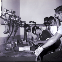 A group of men wearing welding glasses work in a new welding area made possible by the enlargement of the College of Southern Idaho's vocational school. Dwight Bair welds a piece of metal onto a brick. Lyle Canoy sits to his left, watching. Bricks and tools cover the work table. Several tools hang on the wall above the table.