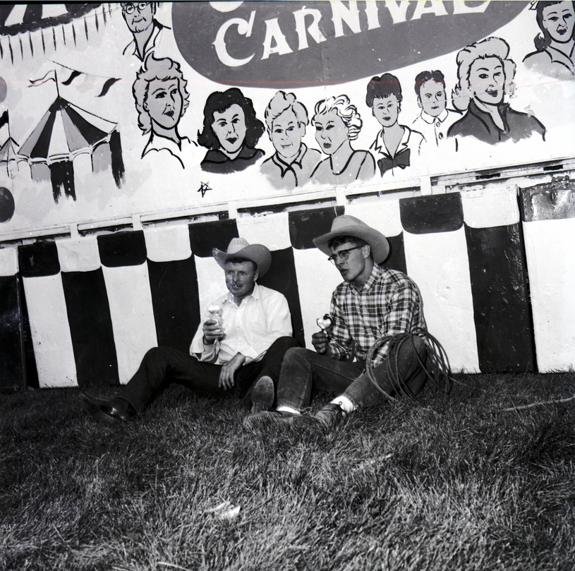Two men wearing cowboy hats sit against a wall enjoying fair food at the Twin Falls County Fair. The man on the left is eating an ice cream cone, while the man on the right has a caramel apple. A rope is draped over his knee. The painting on the wall above them shows a big top tent and several faces with the word "Carnival" above them.