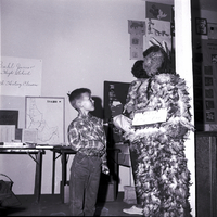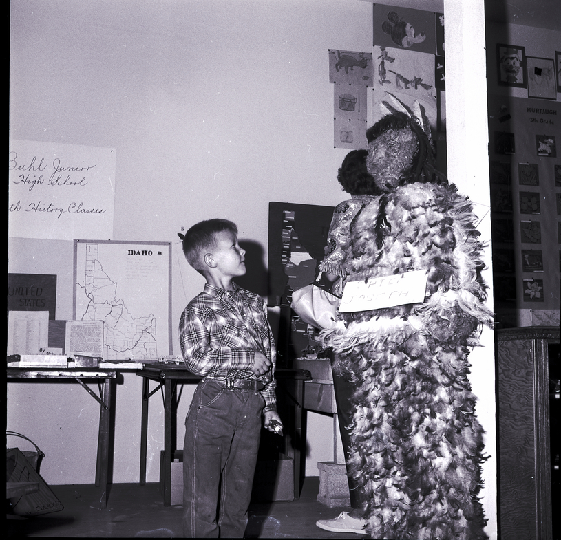 A little boy in a plaid shirt and jeans looks at a model of Chief Joseph built out of feathers inside a show building at the Twin Falls County Fair. Behind him are several tables that have maps of the state of Idaho, and a sign above the display reads "Buhl Junior High School History Classes."