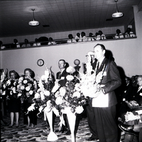 A group of men and women stand behind large stands of flowers or hold bouquets in their hands during the Reception of the Flowers at the 99th annual Communication of the Grand Lodge of Idaho, held at the Twin Falls Masonic Temple. The men, from left to right, are Jack Waegelin, Twin Falls Shrine Club; Floyd Bandy, Twin Falls Chapter of the Royal