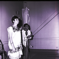 A young man with a bandanna around his throat holds the rope of a hanging pinata at a Mexican posada held at the YM-YWCA building for host families of eleven Mexican youths visiting Twin Falls as part of the Experiment in International Living program. A woman in a dress stands beside him, watching. Leaning against the wall behind them is a guitar.