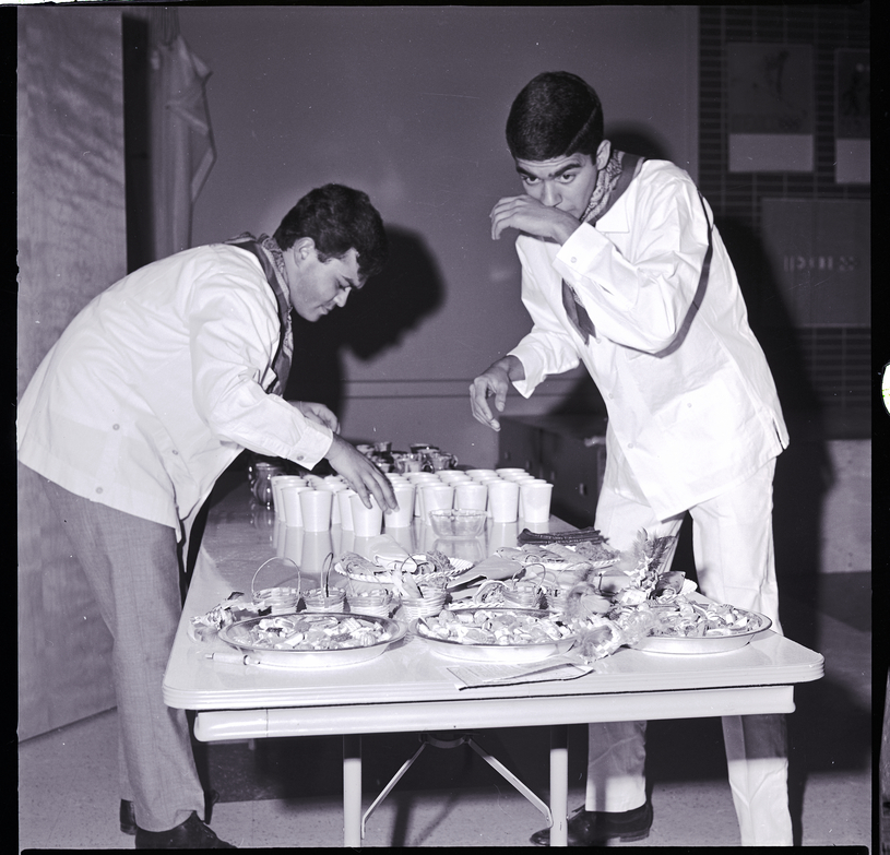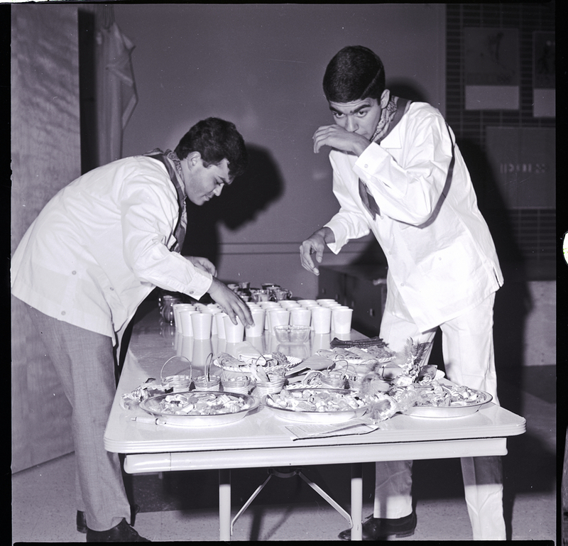 From left to right, Fernando Escalante and Jorge Salgado arrange cups of punch and plates of candy on a refreshment table at a Mexican posada held at the YM-YWCA building for host families of eleven Mexican youths visiting Twin Falls as part of the Experiment in International Living program. The boys are dressed in dressed in white shirts with bandannas around their necks. On the table are some small wicker baskets holding candles as decorations.
