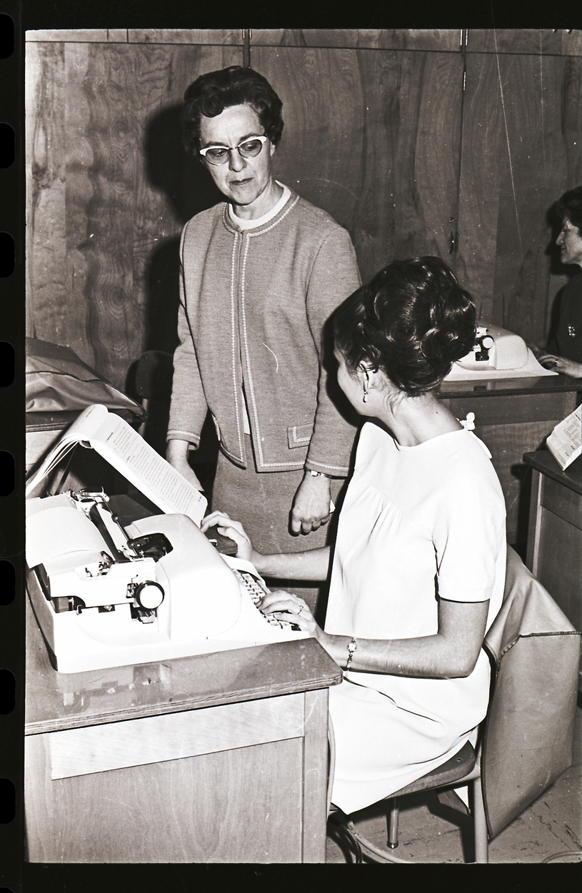 Dr. Adele Thompson gives pointers to Teri Murray, a CSI student in her evening typing class. Teri Murray is seated at a desk with a typewriter on it, and glances over at a typing book propped up on a stand. Other students are working on typewriters around the classroom.