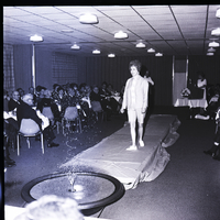 A woman models shorts, a striped shirt, and a jacket at a fashion show during the Filer Kiwanis Club Ladies' Night held at the Twin Falls Holiday Inn. She walks down a runway with a fountain at the end. Several people sit in chairs at the side of the room, watching. At the back of the room is a table covered in a white tablecloth with a bouquet of flowers on top, and Mrs. Morris Carlson, the narrator of the event, stands behind it.