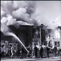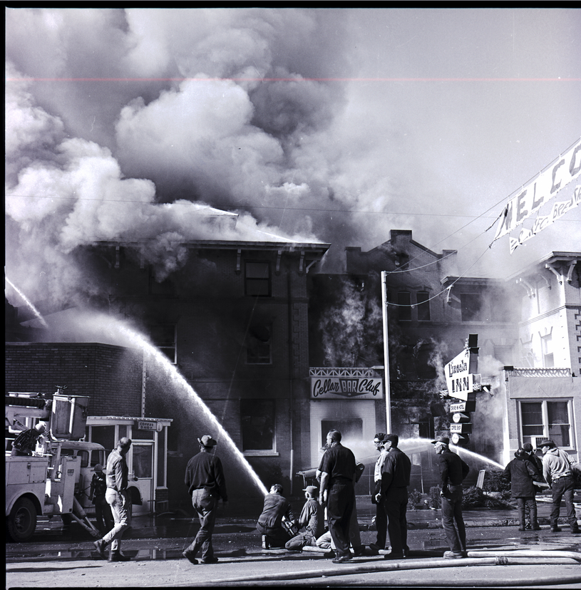 Tongues of flame lick through windows and smoke billows up from the Lincoln Inn in Gooding as fire fighters pour streams of water onto the building, to keep the fire from spreading. The Cellar Bar Club and Gooding County Court House offices in the building were also destroyed in the fire. A fire truck is parked to the side of the scene and bystanders gather on the street, watching the fire.