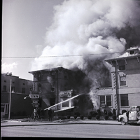 Tongues of flame lick through windows and smoke billows up from the Lincoln Inn in Gooding as fire fighters pour streams of water onto the building, to keep the fire from spreading. The Cellar Bar Club and Gooding County Court House offices in the building were also destroyed in the fire. A truck is parked on the side of the street outside the building, and long hoses trail over the street.
