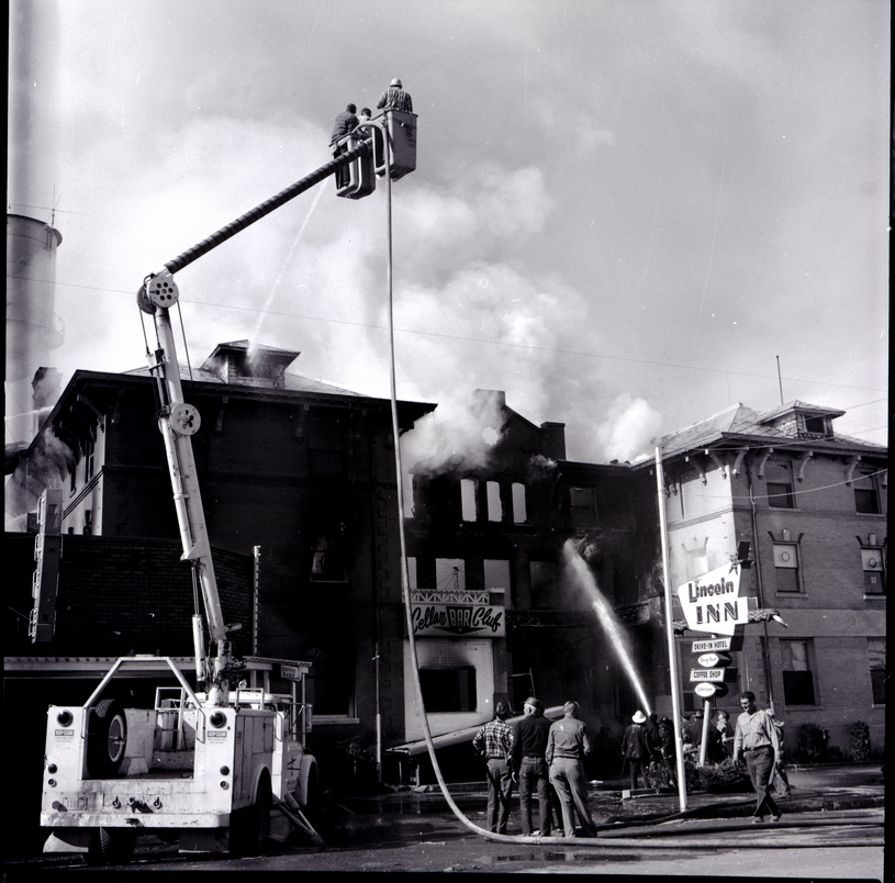 Tongues of flame lick through windows and smoke billows up from the Lincoln Inn in Gooding as fire fighters pour streams of water onto the building, to keep the fire from spreading. The Cellar Bar Club and Gooding County Court House offices in the building were also destroyed in the fire. A fire truck is parked to the side of the scene and lifts three firefighters into the air in a bucket to fight the flames on the roof. Bystanders gather on the street, watching the fire.