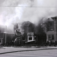Tongues of flame lick through windows and smoke billows up from the Lincoln Inn in Gooding as fire fighters pour streams of water onto the building, to keep the fire from spreading. The Cellar Bar Club and Gooding County Court House offices in the building were also destroyed in the fire. Long hoses trail along the street.