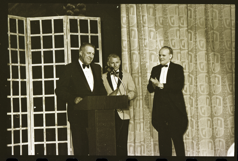 Three men dressed in suits and tow ties stand on stage at the Filer High School auditorium during an awards ceremony after the opening night performance of the Dilettante's production of "The Sound of Music." Behind the podium is Duke Wiseman, principal at O'Leary Junior High School. A lattice and a long drape decorate the stage behind them.