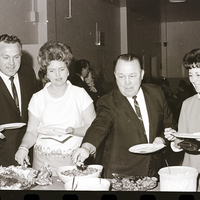 The buffet table is an inviting setting for Mr. and Mrs. Pat Hamilton, left, and Mr. and Mrs. Rex Engelking during the recent dinner-dance at the Buhl National Guard Armory hosted by the Exemplar Chapter, Beta Sigma Phi, as the first of several planned events to raise money to match funds available for expansion of the Buhl Public Library and improve lighting at the high school football field and city softball park. On the table is a tray of meat, bowls of salad, a vegetable platter, and a stack of paper plates. Other party attendees are seen dining or visiting in the background.