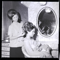 Mrs. John Anderson II has her hair styled in by Bonnie Reid at the Swingin' Set in preparation for the St. Edward's Parents Club's annual fashion show. Fashions will be supplied by The Paris, Paris Jr., and Van's Department Store. Mrs. Anderson is seated in a chair and wearing a ruffled blouse while Ms. Reid stands behind her arranging a wiglet of curls on top of her head. A mirror hangs on the wall beside her. In the corner is a dresser with a vase of flowers on top.