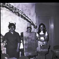 Three members of Nu Phi Nu chapter of Beta Sigma Phi are dressed as characters from "The Wizard of Oz" for their rush party, held at the home of Mrs. Loree Dobbs. From left to right are Katie Sherri, Mendy Abrams, and Mary Larsen. The girls are dressed as the Cowardly Lion, the Tin Man, and Dorothy. Behind them is a decorated background of a pot of gold with a rainbow of streamers arching from it.