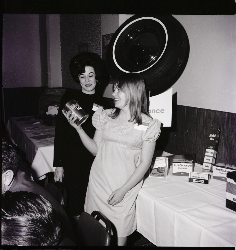 From left to right, Donna Ott and Judy Carver look over a display of car supplies given away as special prizes to guests at a party held for Magic Valley engaged girls at the Rogerson Hotel. The prizes were courtesy of the Twin Fails Bank and Trust Co., the Blue Lakes North Mobil Service and the Welcome Wagon hostesses. Miss Carver holds a can of oil. On the display table behind the women are boxes of oil filters and radiator hoses. A tire hangs on the wall behind them.