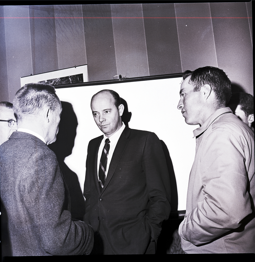 Water is discussed by a Salmon Tract farmer and state officials during a recent water forecast meeting at Hollister. From left to right are Clarence Hedrick, Soil Conservation Service unit conservationist; Morlan Nelson, Soil Conservation Service state snow survey leader; Keith Higginson, state reclamation engineer; and Donald F. McGregor, Salmon Tract farmer. Another man stands behind the group, near a projector screen.