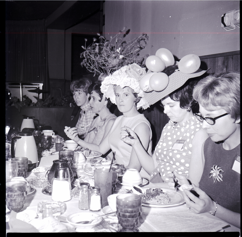 Attendees sit at a dining table enjoying lunch at the Welcome Wagon Newcomers Club hat luncheon held at Kay's Supper Club. Several of the woman are wearing unique hats. One woman is wearing a hat made out of branches and feathers, Rita Bradley is wearing a hat of white ruffles and flowers, and another woman is wearing a hat decorated with balloons. The table is covered in plates of food, cups, bowls, napkins, and silverware.