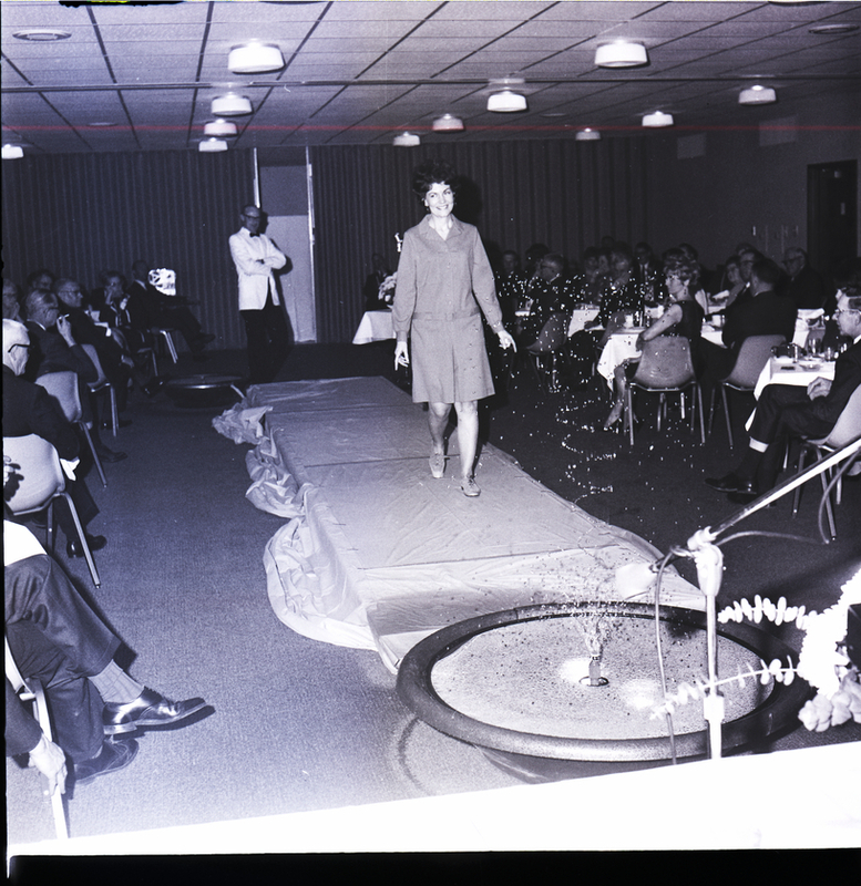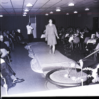 A woman models a dress at a fashion show during the Filer Kiwanis Club Ladies' Night held at the Twin Falls Holiday Inn. She walks down a runway with a fountain at the end. Several people sit in chairs at the side of the room, watching. At the back of the room is a table covered in a white tablecloth with a bouquet of flowers on top, and Mrs. Morris Carlson, the narrator of the event, stands behind it.