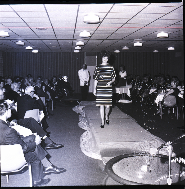 A woman models a striped dress at a fashion show during the Filer Kiwanis Club Ladies' Night held at the Twin Falls Holiday Inn. She walks down a runway with a fountain at the end. Several people sit in chairs at the side of the room, watching. At the back of the room is a table covered in a white tablecloth with a bouquet of flowers on top, and Mrs. Morris Carlson, the narrator of the event, stands behind it.