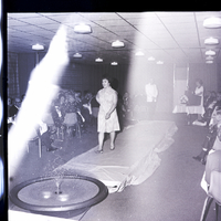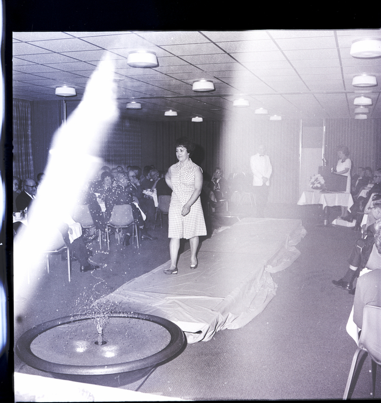 A woman models a polka dot dress at a fashion show during the Filer Kiwanis Club Ladies' Night held at the Twin Falls Holiday Inn. She walks down a runway with a fountain at the end. Several people sit in chairs at the side of the room, watching. At the back of the room is a table covered in a white tablecloth with a bouquet of flowers on top, and Mrs. Morris Carlson, the narrator of the event, stands behind it.