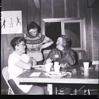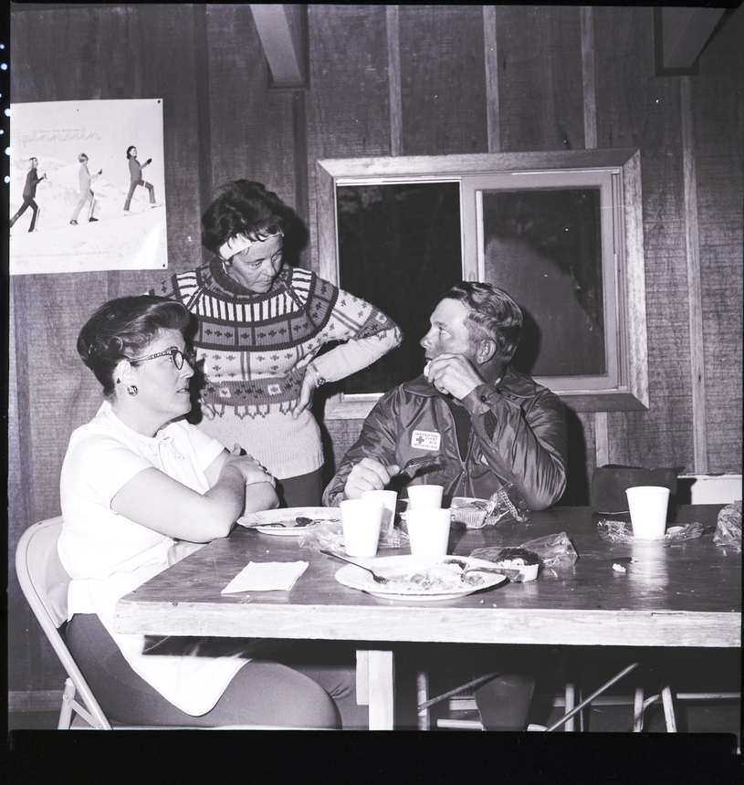 Ski patrolman Tommy Spackman visits with, from left to right, Mrs. Tommy Spackman, and Mrs. Gene Glick after eating dinner during a party at Soldier Mountain Ski Resort. Mr. Spackman is dressed in a jacket with a patch that reads "Instructor First Aid American Red Cross," Mrs. Spackman is wearing a blouse, and Mrs. Glick is wearing a sweater and a headband. Some empty cups and plates are on the table. Behind them on the lodge wall is a poster with some skiers on it.