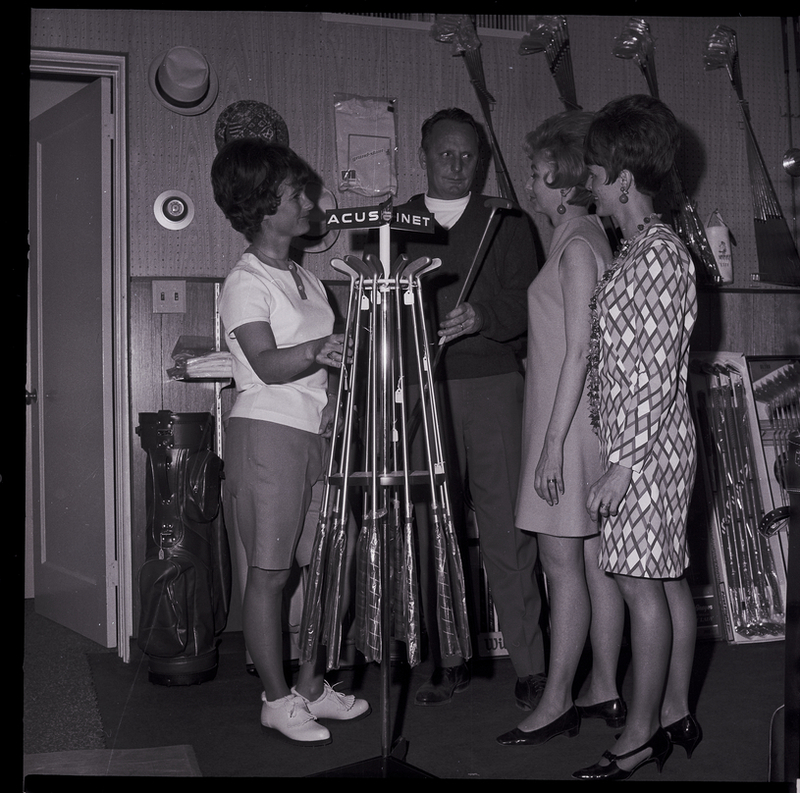 Three women visit with a man in a golf supply store, looking at a wrack of putters. The three women are busy with preparations for the Twin Falls Ladies Municipal Golf Association Fashion Show, to be held at Kay's Supper Club. The fashions will be supplied from The Paris, Roper Clothing Store, Anne's Casuals, and Clyde's Pro Shop. The woman on the right is dressed in a polo shirt and shirts, while the two women on the right are wearing dresses and heels. Several golf clubs and golfing hats hang on the back wall, and a golf club case leans against the wall.