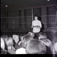 Mrs. Carl Halladay, LDS Stake sports director, stands in front of a volleyball net and explains the rules and regulations at the Stake Volleyball Tournament. Several girls are seated on the floor in front of her, listening. A line of folding chairs are pressed up against the wall at the back of the room.
