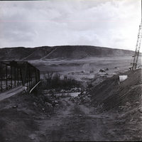To the left, several trucks and cranes work on the construction of the Clear Lakes Bridge. To the right, the existing bridge is seen crossing over the Snake River. Small trees and rocks line the river bank. In the background is a house, and beyond it are hills covered in sagebrush.