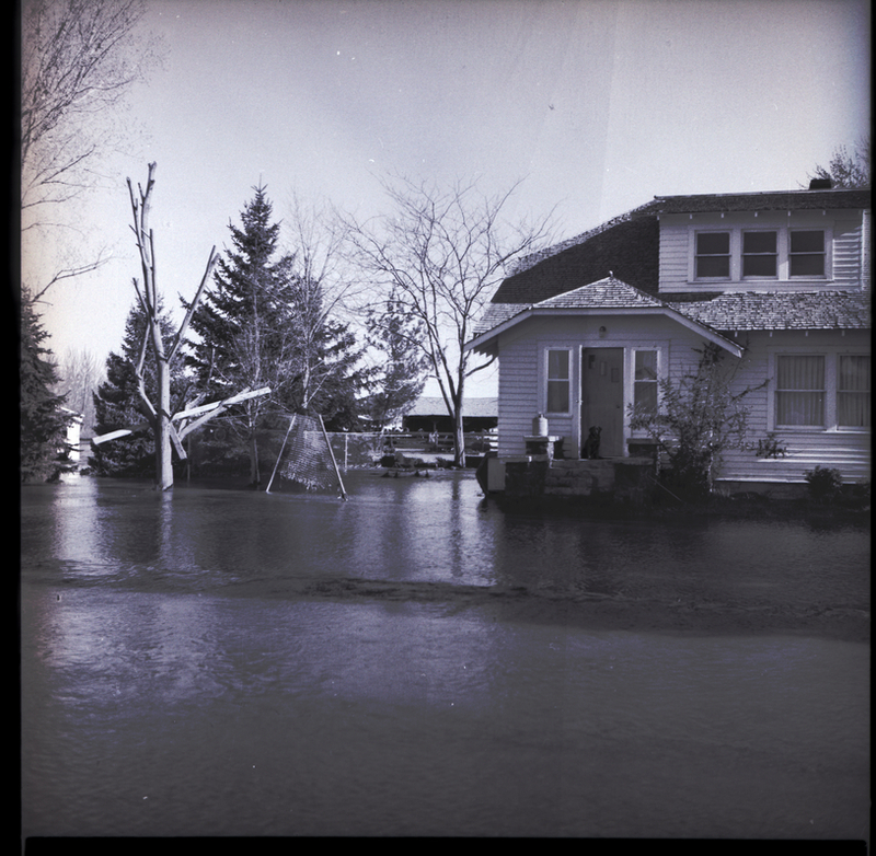 The home of George Trappen is flooded from the Northside Irrigation District Canal break near Jerome. Water surrounds the home. The family Labrador, Lady, sits on the front porch of the home, looking at the water. Several trees around the residence rise up out of the water.