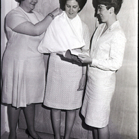- A woman helps put another woman's arm in a sling during a first aid workshop held as part of the activities of the Alpha Nu Chapter's Epsilon Sigma Alpha Founder's Day celebration. A third woman watches, holding a book that says "First Aid" on the cover and spine.