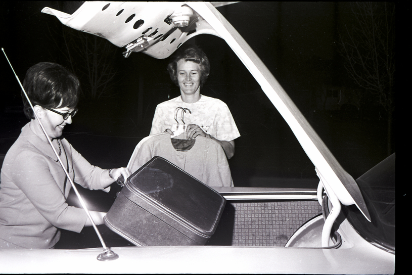 Preparing to go to the state Epsilon Sigma Alpha convention in Lewiston are, from left to right, Alpha Nu chapter members Mrs. Maurice Fuller and Mrs. Richard Johnson. Mrs. Fuller puts a suitcase from the back trunk of a car. Mrs. Johnson stands beside the car, holding several shirts hanging from hangers.