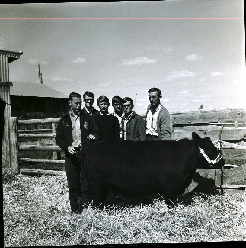 The top team in the recent East Magic Valley FFA District's livestock judging contest held at the Jim Brooks Ranch in Hazelton was the Oakley team. From left to right are Chris Baker, Dean Clark, Bill Anderson, Keith Adams, Steven Smith, and J. R. Swan, instructor. The team stands behind a bull. Behind them is a fence, and a barn is in the background.
