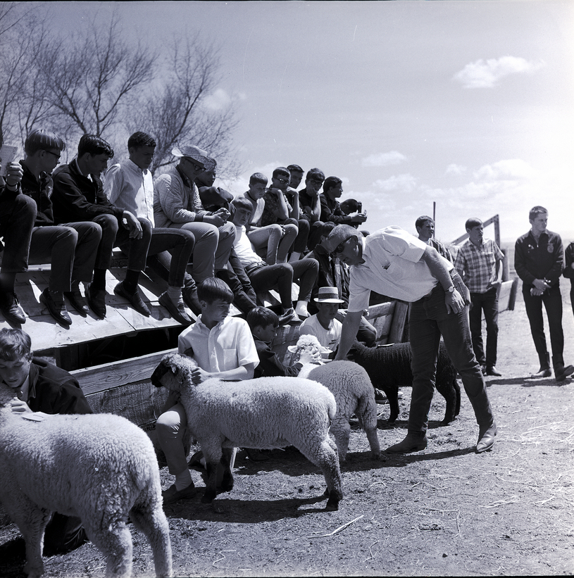 FFA members display their sheep at the East Magic Valley FFA District Livestock Contest held at the Jim Brooks Ranch in Hazelton. Jim Olsen walks down the line, explaining the proper way to judge sheep. A large group of FFA members sit on a sloped pen roof watching the judging.