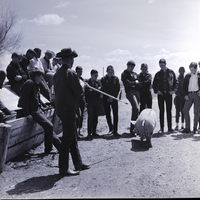 - Bob Loucks, Camas County agent, explains how he judges hogs at the East Magic Valley FFA District Livestock Contest held at the Jim Brooks Ranch in Hazelton. A group of FFA members surround the scene. Several members sit on a sloped pen roof, watching the hog.