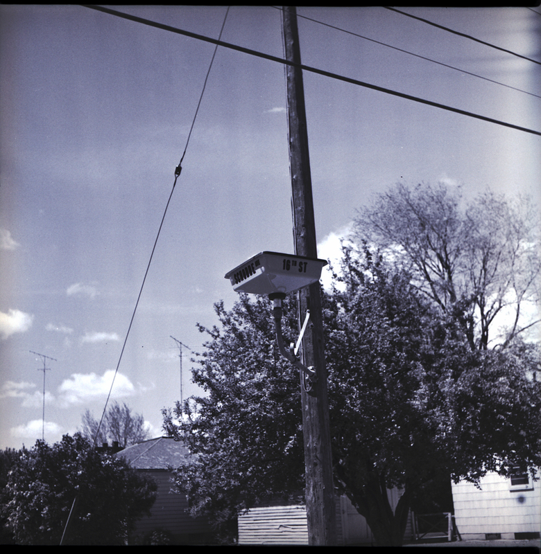 - A new street sign at the corner of Schodde Avenue and 16th Street in Burley is attached to the side of a telephone pole. Houses and big leafy trees are visible behind the telephone pole.