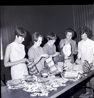 KEL 874 Preparing tote bags for the International Order of Job's Daughters Grand Council are, from left to right, Kathy Griffith, Vicki Knight, and Linda Sonius, honored queens of the three local bethels, Mrs. Marian Jenkins, and Mrs. Don Sonius. Members of the three bethels in Twin Falls, No. 43, 19, and 56, are making the tote bags and acquiring items to fill them for each girl in attendance at the Grand Council. A variety of materials, many of which were donated by merchants in the Magic Valley, are spread out on a table.
