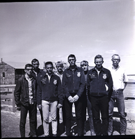 KEL 876 Officers of the East Magic Valley FFA district gather at Jim Brooks Ranch in Hazelton. From left to right are Steve Severe, parliamentarian; Dick Roemer, secretary; Terrel Kidd, president; George Grant, assistant reporter; Ardel Wickel, vice president; Lynn Bradshaw, sentinel; Jim Lattimer, treasurer, and Del Roemer, reporter. A few of the boys are wearing their FFA jackets. Behind them is a fence surrounding a corral. A barn is in the background.